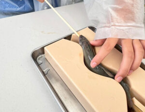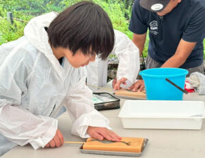 捕まえたアユは、串を刺して塩焼きにします。串打ちをするにあたり、講師を務める清流長良川あゆパーク 体験活動総支配人の後藤 克仁先生から「生きものから命をいただくこと」について話を聞きました。笑顔いっぱいのワクワクとしたつかみ取りとは雰囲気が一遍し、子ども達は真剣な表情でアユに向き合い、串を打ちました。魚を捕まえるとはどういうことなのか、他の命が食べ物として私たちの命へとつながる、そのプロセスに触れ、食べ物への感謝の気持ちがリアルな感覚として心に刻まれました。
