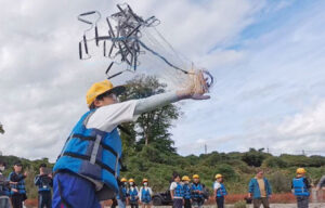 瀬張り網漁を行っている日置天治さんに、漁で使う自作の網を見せてもらい、網の投げ方やアユの捕らえ方を教えてもらいました。続いて、児童らは河川敷で網を投げる体験を行いました。多くのアユを捉えるには、網を狙った場所に広がるように投げる必要がありますが、実際に投げてみると、広げることはもちろん、思った場所に投げるのは至難の業。子どもたちは、漁には熟練の技が必要だと知りました。