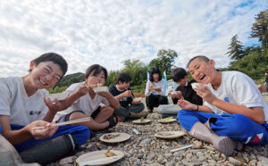 網を投げる体験に続いて、鮎の塩焼きに挑戦しました。アユが泳いでいる形のように、くの字やS字型に曲げて串を刺します。児童らは、真剣な表情で命と向き合い、それぞれに串打ちを行いました。焼きあがったアユは、皮はパリッと香ばしく、身はふっくらジューシー。こんなに美味しいアユが、自分たちの学校の近くの川に棲んでいるということを知り、地域の魅力を再発見するとともに、川や海の恵み、豊かさを体感しました。