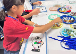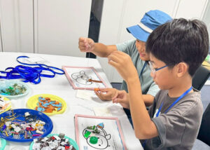 最後に、ごみを減らすためのアイデアのひとつとして「アップサイクルアート」に取り組みました。アップサイクルとは、捨てられるはずだったものに新しい価値を与えて生まれ変わらせること。今回は、細かくなった食品トレーやたまごのパック、タイルやネジ、ペットボトルの蓋など、ごみとして処分される予定だったものを素材として、オリジナルの作品を作りました。