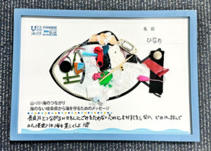 廃材が子ども達の手で個性豊かなアート作品に生まれ変わりました。作品には、山・川・海へのつながりを通して、海を持たない私たちができることや海への想いなどをメッセージとして記載しました。また、作品をそれぞれに発表し、学習を締めくくりました。子ども達の作品は、海と日本プロジェクト岐阜のホームページで紹介予定です。