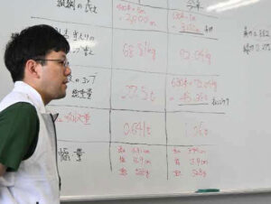 今回の奥尻島ブルーカーボン調査と奥尻島体験プログラムづくりを担当した北海道マリンイノベーション社の安藤さんから、今年のCO₂吸収量の計算にあたり、今回の養殖網の⻑さや網1本あたりのコンブの重量、含水率、炭素含有率などの説明があり、その後、それらを基礎データとして複雑な計算式に入⼒・計算する作業に、参加者全員で取り組みました。