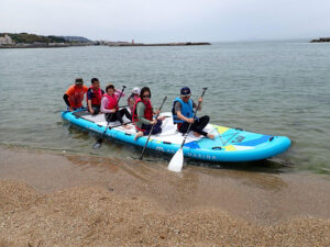 第1回は5月なので少し肌寒く海も冷たい環境でした。ヨガ講師のさわこ先生の呼びかけで参加者の皆さんとビーチクリーン活動のあと、砂浜にヨガマットを敷いて約1時間のビーチヨガです。身体を動かしていると不思議とぽかぽかして上着を脱いで半袖になる人も居ました。ヨガが初めての参加者が2人居られましたが、口々に身体の柔軟と凝りがなくなってとても心地がよいことを言われていました。その後は、今春購入して初めて海に浮かべたばかりメガサップで海上散歩を楽しみました。穏やかな海、透き通った海中、約2時間半のイベントでした。感想は、最高に気持ちいい、次回も参加します。もっとたくさんの人にこの体験を知ってもらいたいなどでした。この事業が盛り上がることを期待して、今年度がんばっていきたいと思います。