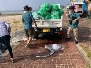 今回もさわこ先生の段取りで、最初に参加者の皆さんに海ごみゼロごみ袋を配布してビーチクリーン活動を実施しました。そしてビーチヨガです。写真に写るヨガマットの色が違うのは、事務局が最寄りのリサイクルショップに通って中古ヨガマットを少し買い集めてくれています。やっと目標の20枚に近づいてきました。新品を発注することは簡単なことですが、海と環境のことを主軸として事業を開催している団体なのでSDGsの観点からどの事業(例えば子ども用のライフジャケットなど)においてもリサイクル用品を購入して使用しています。そのあたりの私たちの思いは、参加者の皆さまに毎回お伝えしています。今回も約1時間の丁寧なビーチヨガ、その後はカヤック体験、メガサップ体験を開催しました。参加者の皆さんはカヤックやメガサップの準備や片付けを進んで手伝ってくださる方ばかりなので、スタッフはとても助かりますし、気持よく運営ができていることに毎回感謝しています。回収した海洋ごみは、スタッフが翌日月曜日朝に北淡震災記念館所有の軽トラックを借りて、淡路市のごみ処理施設夕陽が丘処分場へ搬入しました。