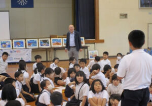 原画の展示による予備知識の付与の後、5月30日(金)午後(5~6時間目)の事前教養に臨み、4年生95名に対し、「うみがめマリンの大冒険」物語の製作経緯を説明するとともに海洋プラスチック汚染問題について、質疑応答を含め対話形式で一緒に考える出前授業を行いました。