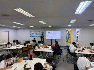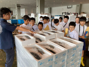 「海にまつわるお仕事」について学ぶ「海と産業」班は、最初にかごしま水族館を訪れました。講師として柏木由香利さんをお招きし、水族館での仕事内容や生き物のお世話についてお話を伺いました。その後、バックヤードに移動してジンベエザメの食事の様子を見学。子どもたちは貴重な体験に興味津々でした。続いて、鹿児島市中央卸売市場・魚類市場を訪問し、セリを終えた市場の見学や魚類市場での仕事について学習しました。普段食卓に並ぶ魚がどのような流れで私たちのもとに届くのか、その過程と関わる人々の仕事を知ることができました。さらに、山川水産加工業共同組合の方々にもお越しいただき、鹿児島を代表する水産加工品である鰹節について学びました。鰹節ができるまでの工程や、削り体験も行い、子どもたちは真剣に取り組んでいました。普段はなかなか触れることのない「海に関わる仕事」について理解を深める貴重な一日となりました。