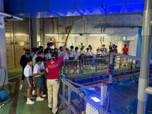 「海と文化」班は、海にまつわる文化について調査を行いました。午前中は祇園之洲公園にある「われは海の子」の歌碑を見学。歌碑が建てられた経緯や背景について学び、郷土出身の作詞家・宮原晃一郎氏の想いに触れながら、「われは海の子」を合唱しました。その後、かごしま水族館へ移動し、錦江湾に生息する生き物について学習。大水槽のバックヤードでジンベエザメが泳ぐ姿を見学するなど、普段は入ることのできない水族館の裏側を調査しました。午後は鹿児島市中央卸売市場・魚類市場を訪れ、いお・かごしま魚食普及拡大推進協議会会長の山口憲一郎氏を講師に迎え、魚類市場の今昔や錦江湾で食べられる魚とその料理といった「食文化」について学びました。さらに、黎明館の古殿志賀子さんを講師にお招きし、「海の暮らしと民具」をテーマに、海で使われていた民具や塩田の歴史についてお話を伺いました。子どもたちは、海にまつわるさまざまな文化に触れ、地域の海への理解を深める貴重な体験となりました。
