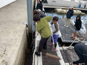 船が係留されている場所で、海洋ゴミを拾う活動を行いました。前の週に台風が来ていた影響で、かなり多くのごみが海に漂流している状態でした。このまま漂流させておくと、係留している船に当たってしまうと故障にもつながる状態でしたので海洋ゴミに関するごみ問題のお話をしたうえで、実際に拾うことを行いました。いつも遊んだり、ヨットに乗ったりする海に、こんなにも多くの漂流物があることに皆驚いている様子でした。