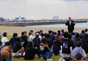 東扇島東公園の人工海浜「かわさきの浜」にて、広域的防災拠点や人工海浜周辺の生き物やマイクロプラスチックについて説明を受けるとともに、実際に人工海浜の清掃を行うことで海の環境の保護する重要性を体感しました。