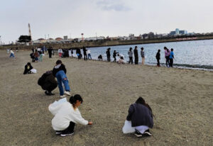 東扇島東公園の人工海浜「かわさきの浜」にて、広域的防災拠点や人工海浜周辺の生き物やマイクロプラスチックについて説明を受けるとともに、実際に人工海浜の清掃を行うことで海の環境の保護する重要性を体感しました。