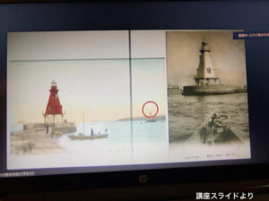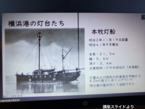 また灯台の機能をもった他の設備(施設)として明治期に設置されていた灯台船も紹介されました。灯台を設置するのが難しい場所にも灯台の機能を持たせることができます。横浜では本牧で明治2年11月から運用されていました。写真ではモノクロですが実際には赤く塗られ、掲げられた丸い球体が夜間はランタンの灯がともっていたそうです。