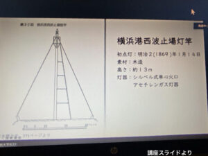 現在の本牧防波堤灯台と同じ役割だったようです。つづいて航路標識(横浜港西防波堤灯竿)が紹介されました。その場所もなんと講座会場象の鼻テラスの目の前、昔々イギリス波止場と呼ばれていた、象の鼻波止場の先端部分にありました。
