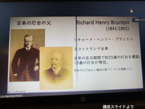 上記のような灯台船や灯竿を日本に設置した人物がいます。スコットランド出身で日本の灯台の父、リチャード・ヘンリー・ブラントンです。在日していた約8年の間に25基くらいの灯台を建設しました。また横浜ではまちづくりにも貢献したことで有名ですが、じつは当時(実現しませんでしたが)築港計画も設計提案されていたそうです。当時は国としても財政が苦しい時期だったようです。