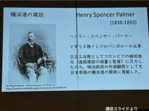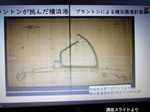 このパーマーの実行計画にも登場する先ほどの横浜港のシンボル(赤灯台)もこの図に登場しています。ただ講師はこの赤灯台がパーマーの設計によるものとは考えていないようで、まだ調査が必要だと語っていました。この頃(明治22年)すでに日本人技師も育っていたので、ひょっとしたら日本人の設計なのかもしれない、と言う可能性があるのかもしれません。