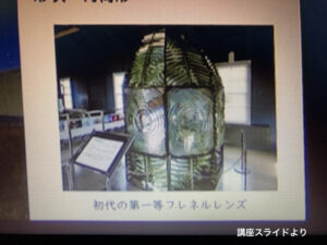 歴史的背景として光源がランタンなど小さな炎からガスバーナーなどへ変化するにつれ、遠くに光を届けるためにレンズサイズが大きくなってきたこと、またその大きさ・重量のバランスからレンズが改良されてきたたこと。レンズには歴史的な進化が残されていること。残念ながらLEDの登場により大型レンズが減少傾向にある事などが語られた際は「なんでLEDが開発されたんだろう」とマニアックな嘆きもあり、会場を笑わせていました。もちろん講師は灯台の進化を肯定しつつ、古き良き時代の灯台についての熱い想いを感じさせる一コマでした。