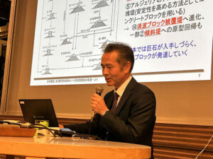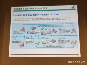 自己紹介・会社紹介の流れから会社が取り組まれている土木・地質改良・ブロックという3つの事業とそれを支える研究所の紹介、そして消波ブロック(テトラポッド)がどのようなところで必要とされているのか、と言う紹介がありました。消波ブロックと言うと海の波だけを想像してしまいますが、実際には河川でも使われており、波の力を弱めると言うよりも幅広く水の力を弱め、護岸や堤防などを守るものだと理解できました。またテトラポッドの形以外に様々な消波ブロック関連の製品がありました。そしてその消波ブロックの基礎として必要とされる袋詰めの捨て石なども紹介されました。