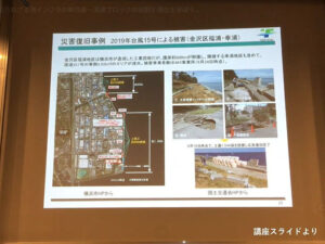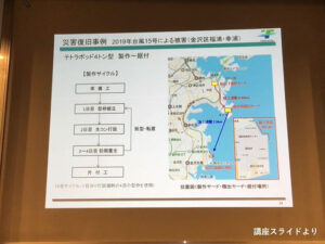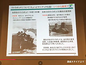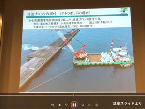 続いて2019年の台風15号で被害を受けた横浜市金沢区の福浦・幸浦での復旧工事の例が紹介されました。4トン型の消波ブロックを1万個以上設置し、護岸のかさ上げと波の軽減を図ったそうです。また消波ブロックの意外な使われ方として、陸上でのモニュメントとしての利用や、海外での戦車避けとしての防衛施設における利用例も紹介されました。