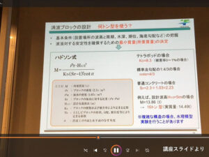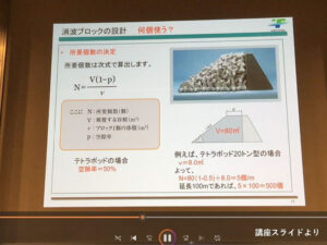 講師は、テトラポッドの設計方法についてハドソン式という計算式を用いて波高や勾配からブロックの必要重量を算出すると語りました。「そんなに難しくない式ですが」と仰っていましたが、筆者には???でした。テトラポッドの標準勾配は1対1.333で、空隙率は50%であるとのことなのですが、なかなかピンと来ず、とりあえずは積み上げたときにその表面の半分が隙間で構成されており、水の勢いを弱めると言うことなのだろうと言う理解をしました。また設置面積や設置断面図から消波ブロックの設置個数も事前に計算できるようです。