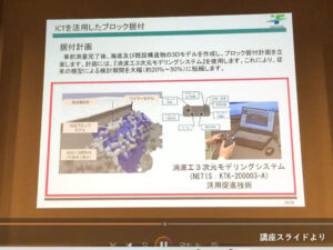 またその製造方法については、型枠を組み立て、コンクリートを流し込み、バイブレーターで締め固めた後、養生して脱型するプロセスが紹介されました。据え付けは陸上クレーンや海上クレーンで行われ、最近ではICT技術を活用して3Dモデリングやリアルタイム水中可視化、AR技術などが使われていることも説明されました。