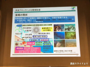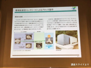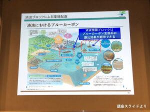 「ここからが今回強くお伝えしたいところです。」と講師が強調されお話を始められたのが消波ブロック事業による環境保全への貢献事例でした。海洋生態系に取り込まれた炭素を指すブルーカーボンの概念が2009年に国連環境計画の報告書で初めて言及され、海藻、海草、干潟、マングローブなどがCO2を固定する役割を果たしていることが紹介されました。地球温暖化による海水温上昇が海藻の生育に悪影響を与える中、消波ブロックの形状を工夫して海藻が付きやすくしたり、イオンカルチャーという栄養素を供給する素材を取り付けたりする取り組みが行われていることが説明されました。この海藻がつきやすくなる消波ブロックの形状を「稜線」と表現されていました。その稜線を発展させた形がテトラネオというカクカクしたフォルムの消波ブロックです。さらにはCO2削減のための環境配慮型コンクリートの開発についても紹介され、知られざる港インフラの舞台裏を支える消波ブロックとその他関連製品や研究のお話で講座が締めくくられました。