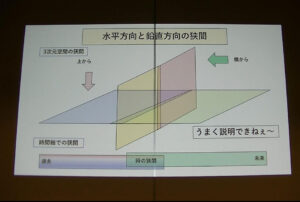 ただそれぞれの明確な説明となるとなかなか表現が難しいようで「水平方向と鉛直方向の狭間」説明するスライドには「うまく説明できねぇ~」と書いてありました。