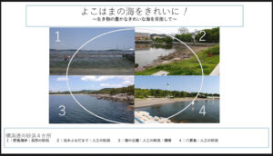 また講師は山下公園で開催される世界トライアスロン大会 横浜大会でも環境系の調査などでお仕事をされていました。その調査などを通じて山下公園前の海中ごみであったり実はわかめがたくさん生えていたりと言う画像を数多く見せてくれました。