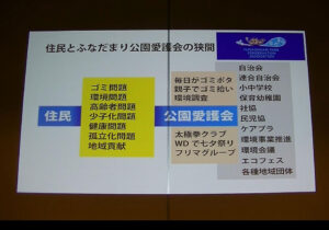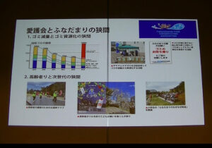 その成果としてこれまでの活動を評価され市長表彰をお受けになる予定です。これは清掃だけではなく地域課題を解決するコミュニティづくりなども評価されているのだと筆者は感じました。清掃活動を続けることで水辺がきれいになり、最近は子どもたちも水辺に近づくようになり地域の方からも褒められることが増えてきました。この清掃活動の将来形として、愛護会は落ちているごみを継続的に拾うけれど、ここを訪れるひとのごみはそれぞれが家に持ち帰ってもらうことが次の目標だと高島さんは語ります。またここでもごみの量などがきちんとデータ化され活動の成果がひと目で分かるように整理されています。ここではふなだまりにまつわる様々な狭間のお話を聞きました。
