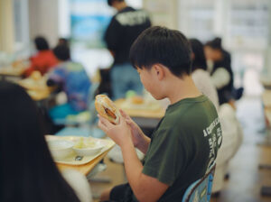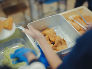 佐伯市内の全小中学校の学校給食で「アイゴのフライ“アイボー”」を提供。パン給食の日では開いたパンにアイゴを挟みお手製のフィッシュバーガーを作って食べる子がいたり、ご飯給食の日も「アイゴ美味しい」とアイゴをおかずに箸が進む様子が印象的でした。給食時には、アイゴや海の学びを深めることのできるオリジナルのランチョンマットを配布するとともに、昨年度事業にて地元高校生と制作した学習用動画「アイゴから学ぶ海の変化」の映像を流してもらい、食べながらも気軽に楽しく学べる工夫を施しました。また、給食時に行われる校内放送でも各校の放送担当の生徒がアイゴの紹介を行い、アイゴや佐伯ウラオモテアクトの取組について知ってもらう機会となりました。