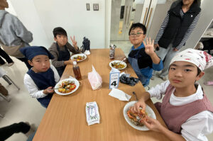 今回、新鮮さも知って欲しいこともあり活き車えびを使用し、箱を開けると車えびが飛び跳ね、会場内は驚きと笑いに包まれました。ただ、活きのいい車えびを扱うのは一苦労…班で協力し合いながら調理をする為、仲間と協力し合う大切さも学べる良い機会となりました。悪戦苦闘しながら作った料理は格別だったようで、参加した子どもたちは美味しそうにパエリアを完食していました。