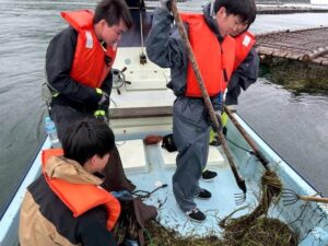 学生はアマモの生育状況や回収方法についてのレクチャーを受けた後、実際に船を乗船し、アマモの回収作業を行いました。作業を通じて、海中の変化や保全の難しさ、また自然環境との関わり方について深く学ぶことができました。