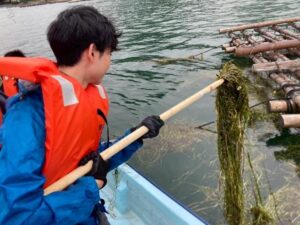学生はアマモの生育状況や回収方法についてのレクチャーを受けた後、実際に船を乗船し、アマモの回収作業を行いました。作業を通じて、海中の変化や保全の難しさ、また自然環境との関わり方について深く学ぶことができました。