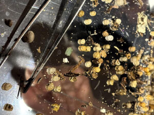 Rキッズは琵琶湖のごみを調査するため、滋賀県守山市の湖畔で清掃活動を行いました。たくさんのごみが流れ着いていて、ごみ袋はすぐにいっぱいになりました。目につくごみだけではなく、砂浜にあるマイクロプラスチック(5mm未満の小さなプラスチック)の量も調査するため、砂を水の張ったボウルに入れ、浮遊物を回収する方法で採取していきました。農業で使用した被覆肥料や細かく砕けたプラスチックが多く見つかり、プラスチックごみが環境に残り続ける実態を知ることができました。