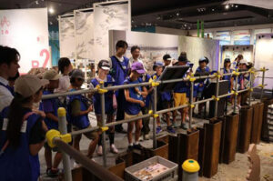 琵琶湖博物館では琵琶湖の環境の変化について学びました。縄文時代中期の貝塚を観察すると、今回自分たちがしじみ漁で獲った貝とは比べ物にもならないくらい大きなしじみがたくさん食べられていたことを知り、しじみが太古から私たちになじみ深い食材であったことを知りました。