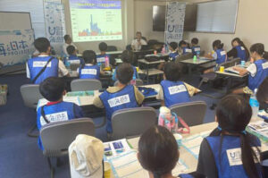 また、大阪府鰮巾着網漁業協同組合の森政次さんには大阪湾では沢山の種類の魚がいるので魚の種類に合わせた漁法で魚を獲っていることなどを教えていただきました。一方で琵琶湖と同じように地球温暖化等の影響を受け漁獲量が減ってしまっていること、魚が小さくなってしまっていることも知り、対策として漁の際に獲れた未熟な魚は放流するといった工夫が行われていることを学びました。琵琶湖の水は瀬田川、宇治川、淀川と名前を変えながら大阪湾まで繋がっています。琵琶湖での問題は海の問題でもあるということを実感し、私たちにできることは何だろう?と子どもたちは真剣に考えていました。