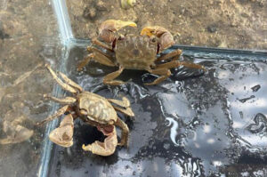 大阪湾と淀川の水が混ざり合う汽水が流れる公園で生き物調査を行いました。公園内に流れる川の塩分濃度を計測すると0.3%の塩水。琵琶湖とは違うカニや魚、シジミが見つかり子どもたちは大喜び。大阪市漁業協同組合の畑中啓吾さんに見つけた生き物について教えていただきました。汽水域に生息するシジミはヤマトシジミと呼ばれるもので、汽水域を中心に生息していること、ヤマトシジミも昔は多く生息していましたが、淀川の河川工事を経て湖底の砂地が減少してしまったことにより個体数は減少している事などを教えていただきました。