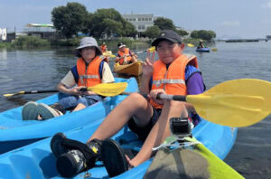最終日は滋賀県の「O’PAL」で琵琶湖の環境と生物の関係について学習しました。ヨシには生き物のすみか、水を綺麗にするといった役割があるが、冬になると枯れてしまい水が汚れる原因となるので、枯れる前に刈り取る必要があること、刈り取ったヨシはすだれやノート、食べ物として再利用できることを学びました。学習した後はカヌーに乗って実際にヨシ帯の見学へ!初めてのカヌーに緊張している子もいましたが、どんどん上達し、楽しそうに琵琶湖を探検し、琵琶湖の豊かさを体感しました。