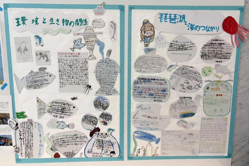 みんなで3日間の活動を振り返った後、1人ずつテーマを決めてレポートを作成しました。みんなが作成したレポートで「琵琶湖と海のつながり」「環境と生き物の関係」の2枚の壁新聞を作成しました。海なし県である滋賀県に住む私たちが琵琶湖だけでなく海を守るためにできることは何か、琵琶湖や海で生活する生き物を守るために私たちにできることは何かなど、それぞれが考え発表しました。