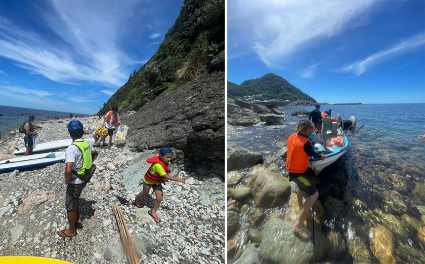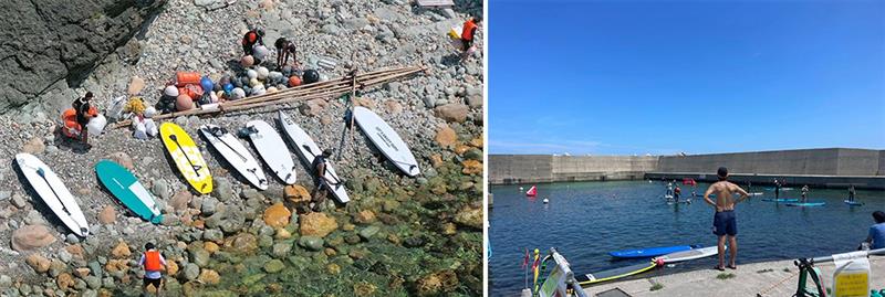 本イベントの大きな特徴は、当日だけで完結する体験会ではなく、地域の人たちと一緒に準備段階からつくり上げてきた点にあります。7月27日には、自治会、小伊津若いもん会、地元の漁師の方々の協力のもと、漕ぎトレビーチクリーンを実施。海岸に流れ着いたブイなどを回収し、それらを活用して水上のアップサイクルコートを製作しました。