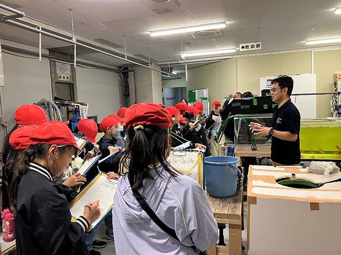 バックヤードでは、海洋生物たちの怪我や病気の状態を管理していることや、魚同士の関係性を理解し適切な環境・健康状態にしてあげることの重要性のお話を聞きました。魚同士にも、相性や力関係があることに驚きながらも熱心にメモをとり、海洋生物との関わり方を学びました。