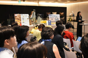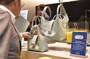 「MARINA」を開発したFUMIKODAの代表幸田フミさんは、「Alliance for the Blueの協働企業の皆様の努⼒で生まれた素材を、毎日気持ちよく使える形に仕⽴てるのが私たちの仕事です。何より、リサイクルに⾒えない品質にこだわりました。「Ocean V leather」はきれいな発色で、形が崩れないため、バッグと相性がいい素材だったと思います」と⼒強く語られていました。
