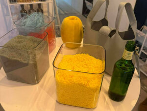会場内には、実際に海から回収された使用済みの廃漁網や漁業用フロートを展示しました。フロートが独自の技術によって再生樹脂や人工皮革へと生まれ変わり、最終的に洗練されたバッグなどのプロダクトへと形を変えるプロセスをご覧いただきました。参加者は、本来捨てられるはずだったものが高い価値を持つ商品へと進化する様子を、実際に手で触れながら体感しました。