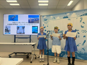 ・「僕は、海のお仕事は海の上や中でやるものだと思っていましたが、海ではないところでもできる海に関係するお仕事もあるということを学びました。例えば(他の小学生が発表していた)海藻ソムリエや、レプリカ作りなど。びっくりしました!』