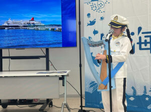 ・「僕は、海のお仕事は海の上や中でやるものだと思っていましたが、海ではないところでもできる海に関係するお仕事もあるということを学びました。例えば(他の小学生が発表していた)海藻ソムリエや、レプリカ作りなど。びっくりしました!』