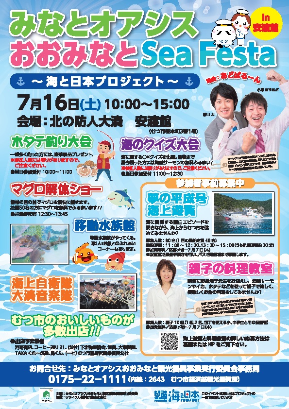 7月16日土曜日、北の防人大湊 安渡館にて、海について楽しく知ることが出来るイベント「みなとオアシスおおみなとSea Festa in 安渡館」を午前10時から午後3時まで開催します。