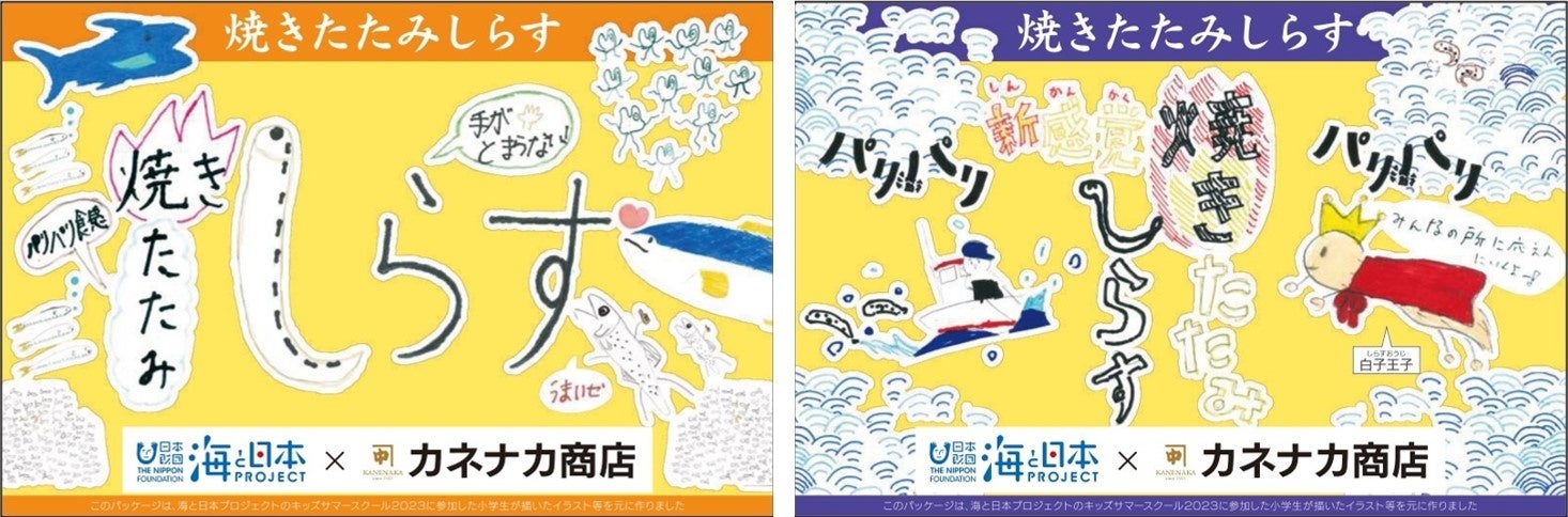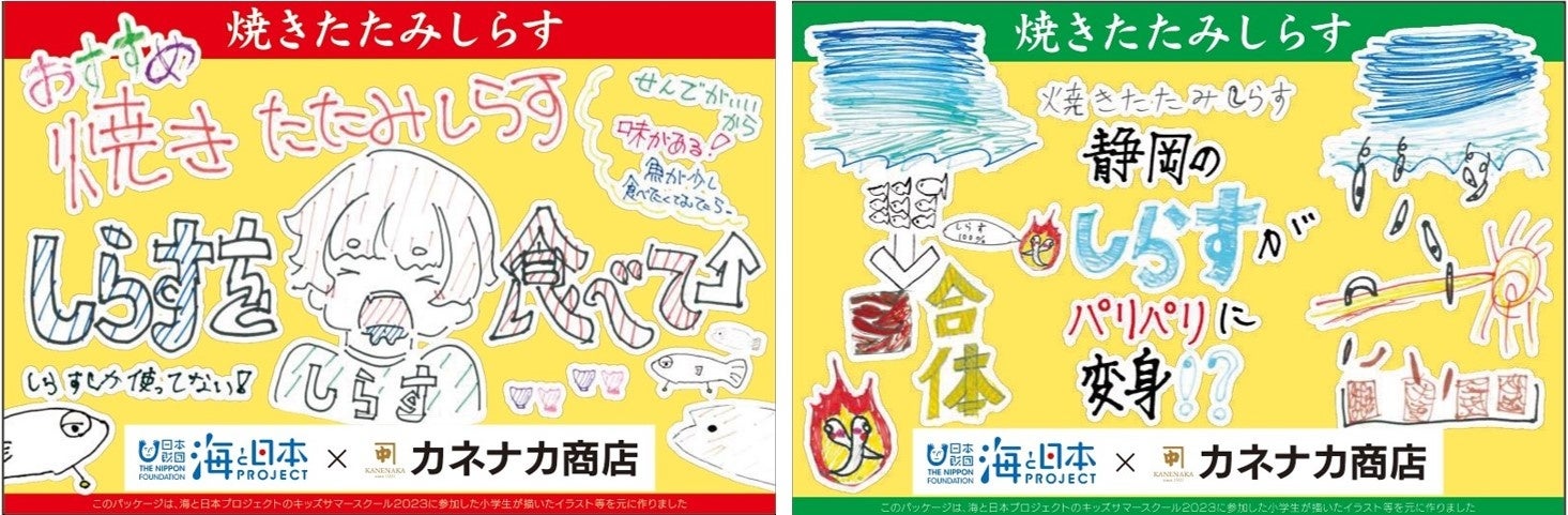 一般社団法人静岡UP(海と日本プロジェクトin静岡県)は、しらす加工の老舗「カネナカ商店」とコラボし「焼きたたみしらす」を販売いたします。このコラボ企画で使用したパッケージラベルは、2023年夏に実施した海と日本プロジェクトin静岡県のオリジナルイベント「キッズサマースクール」で“しらす”について学んだ小学生が描きました。