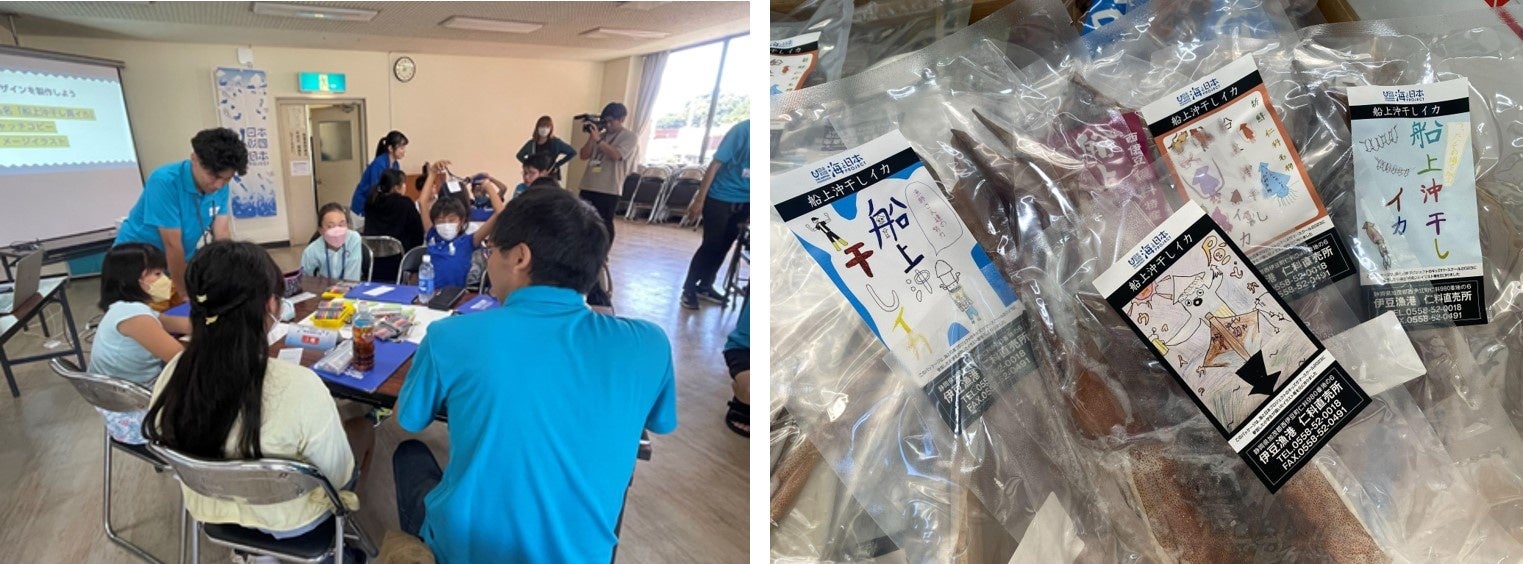 また、2023年夏のキッズサマースクール第2弾では県内全域から選ばれた小学生20名が、駿河湾の東側に位置する西伊豆町の仁科エリアを舞台に、駿河湾で発生する湧昇流を活かした、全国的にも珍しい昼にスルメイカを釣る「西伊豆町の昼獲れマイカ」の学習を通じて、駿河湾に起きている環境変化を学びました。小学生は、学習のアウトプットとして、仁科港のお土産として人気の船上沖干しイカのパッケージラベルのデザインを行いました。イカについて学んだことを生かしてキャッチコピーを作り、各班で役割分担してパッケージのデザインを色鉛筆やマジックを使い描いていきました。完成したコラボフードは、1,000個限定で2023年11月~12月にかけて伊豆漁協協同組合の沖上がり食堂で販売し、好評につき、完売しました。