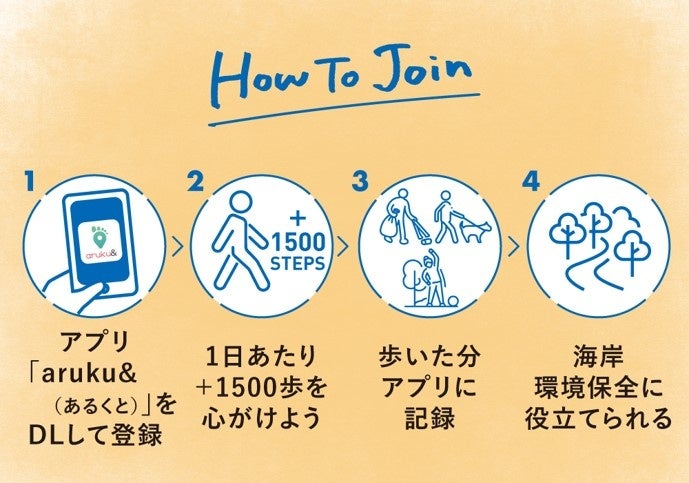 | 参加方法 | ①スマートフォンアプリ「aruku&(あるくと)」をダウンロードし、キャンペーン参加登録を行う。 ②1日「8,500歩」達成を目標にウォーキングを行う。 ★ごみ拾いをしながらのウォーキングには「ごみ拾いポイント」を進呈! ③参加者全員での期間内総歩数「1億歩」達成を目指そう! |