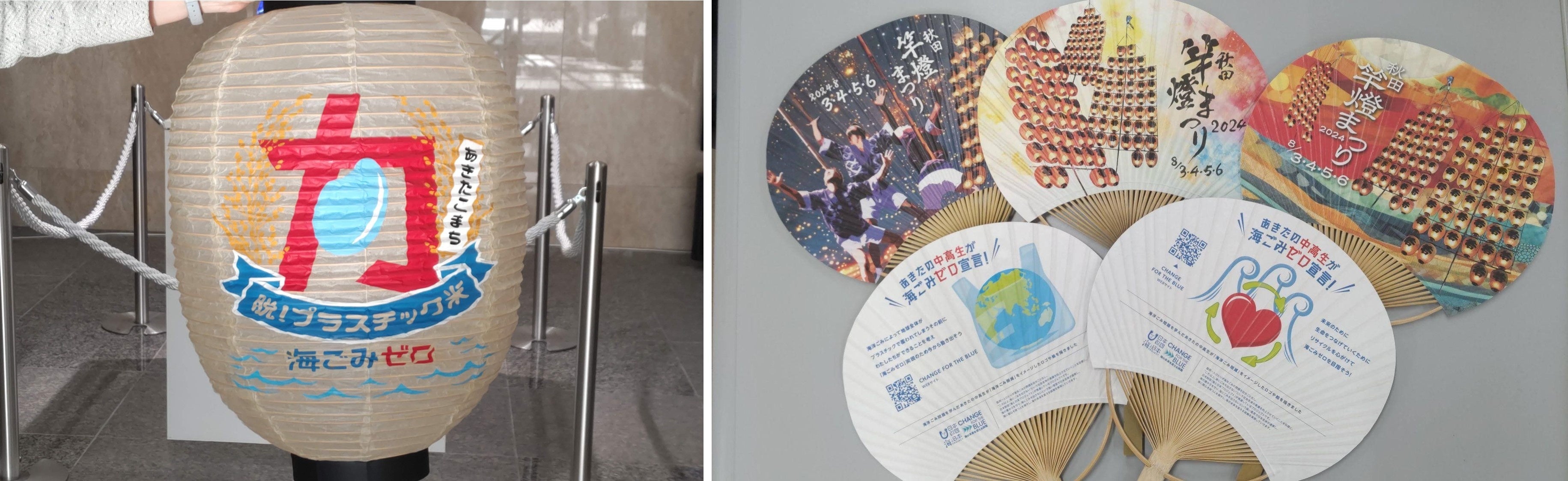 今回の企画では、県民や秋田竿燈まつりに訪れる観光客へ、海洋ごみ問題をもっと知ってもらいたい、自分事として考えてもらいたいという中高生の想いをロゴや絵にして竿燈の提灯に掲示しPRを行います。さらには竹製うちわにも海洋ごみゼロを目指したメッセージと絵を入れ込み、観光客などへ計5000本配布を行います。