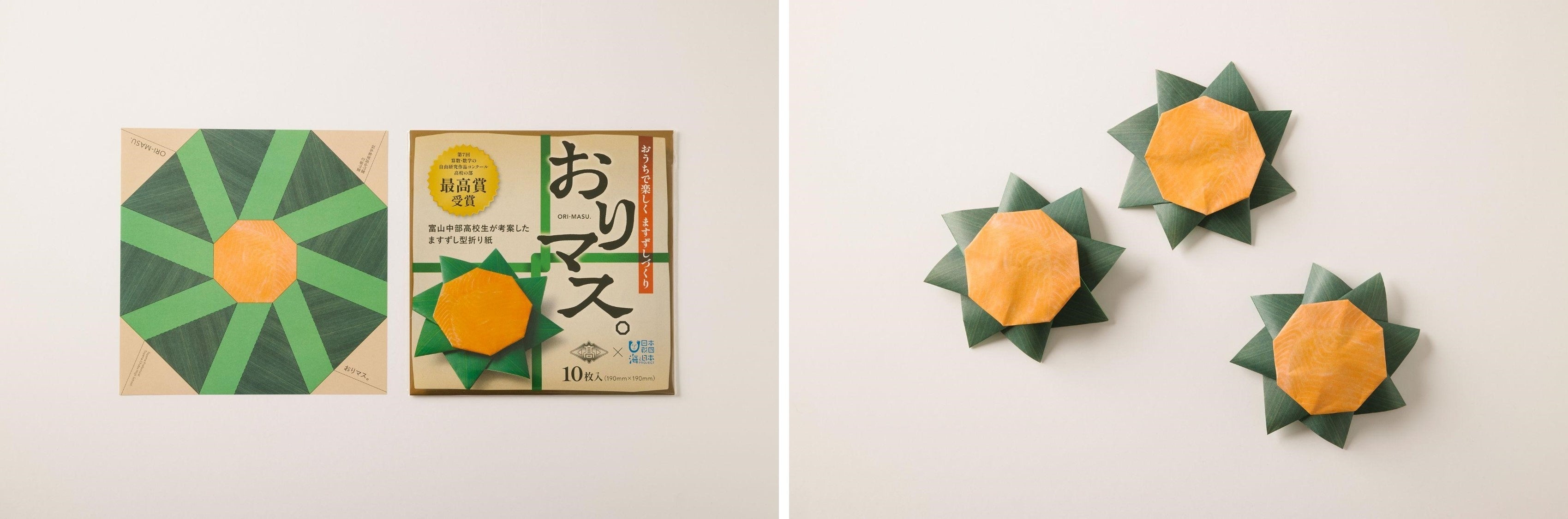 2020年、富山中部高校探求科学科3年の館盛陽香さん、藤山瞳さん、山口天音さん(デザインは杉本結さん)が数学の授業の中で正n角形のねじり折り総数の研究の過程で作成した折り紙が富山県の郷土料理”ますずし”笹の葉を広げた形に似ていることに気が付き、ますずし折り紙の開発にいたりました。その研究成果は、「第7回算数・数学の自由研究作品コンクール」にて全国最優秀賞である塩野直道賞を受賞。開発者が卒業したあとも後輩たちが思いをつなぎ、普及活動や研究を継続し、そして今年、授業のなかで”ますずし”の普及について考える2年生がこの折り紙の商品化を企画。商品名「おりマス。」を考案し、パッケージのデザインに携わるなど、ますずし折り紙を通して富山の誇るべき食文化・ますずしを全国へ発信しようと活動を進めました。