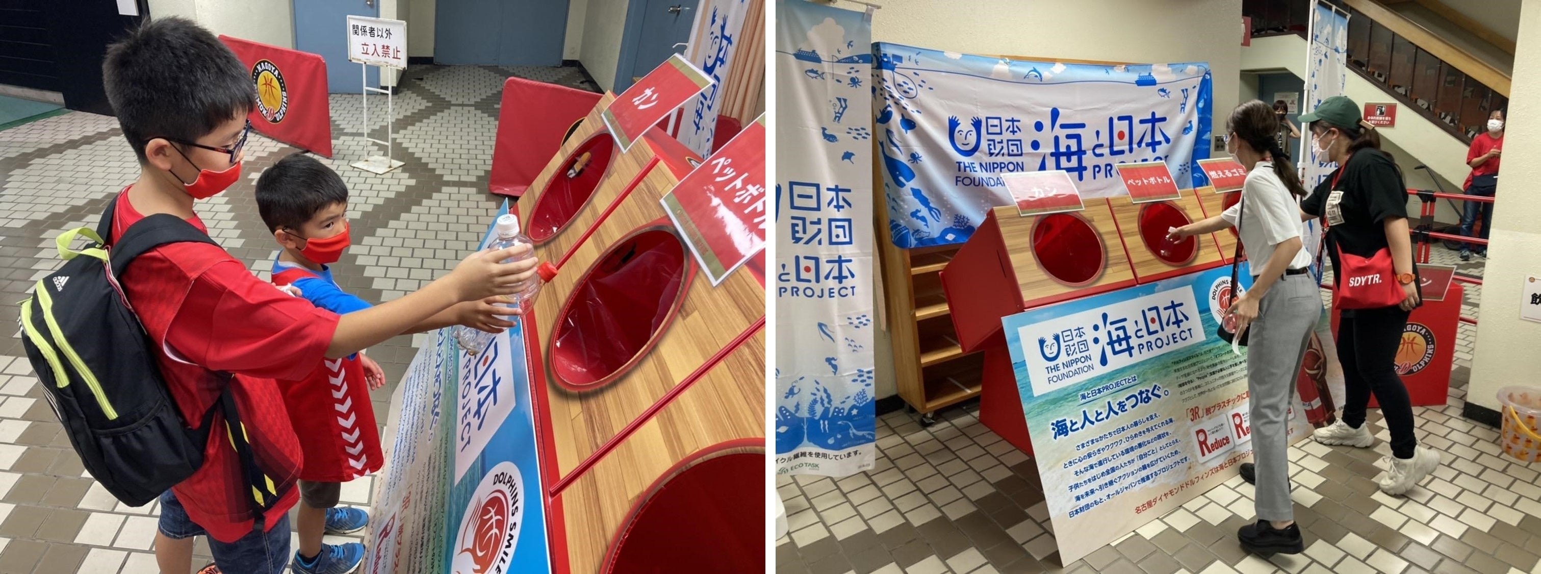 名古屋ダイヤモンドドルフィンズのホームアリーナは愛知県が管理する愛知県体育館。海と日本プロジェクトとコラボレーションしたごみ箱をシーズンを通して設置し、観客が捨てるペットボトルを中心としたごみへの意識促進を狙います。
